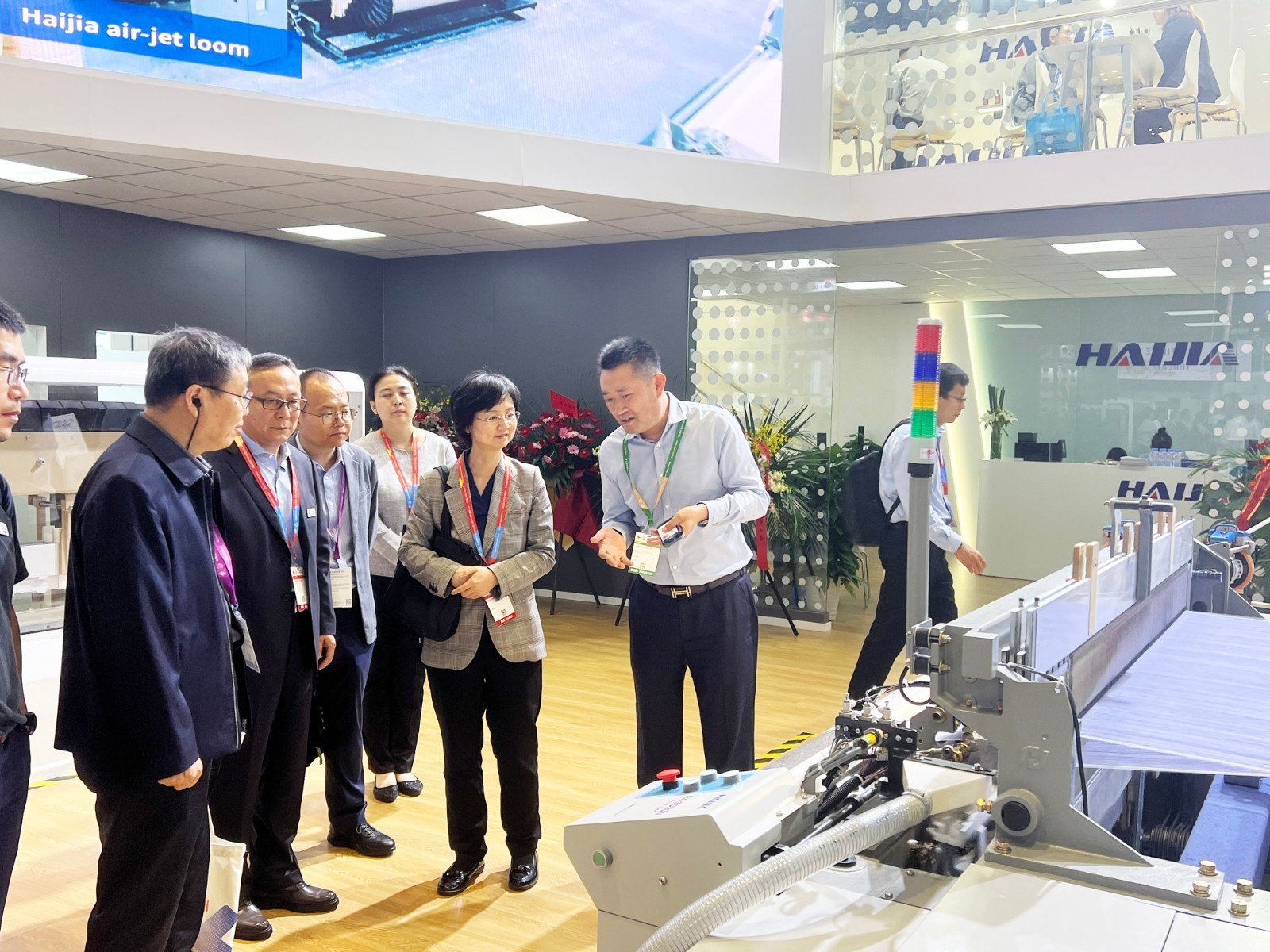 工業(yè)和信息化部消費(fèi)品工業(yè)司副司長(zhǎng)鄭艷一行領(lǐng)導(dǎo)參觀海佳展位,董事長(zhǎng)王安儉重點(diǎn)介紹了海佳噴氣織機(jī)創(chuàng)新賣(mài)點(diǎn)。